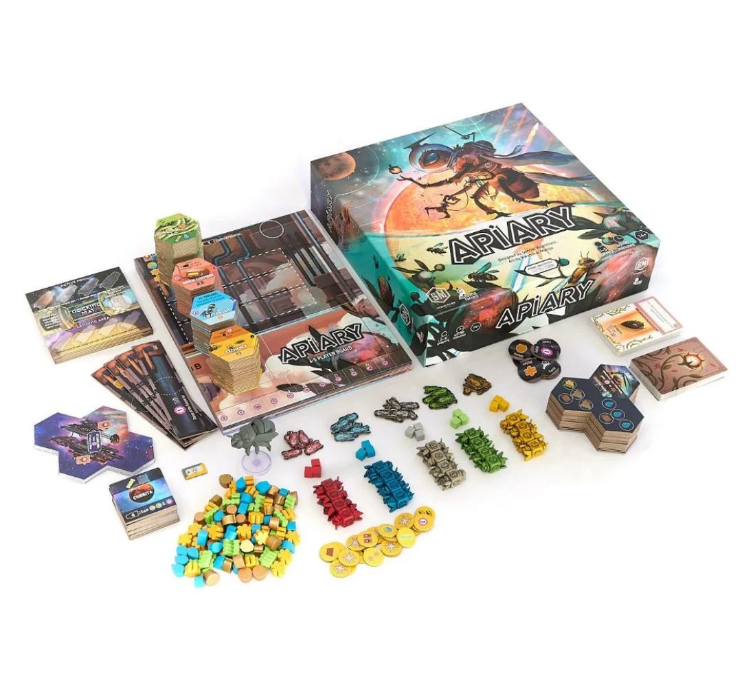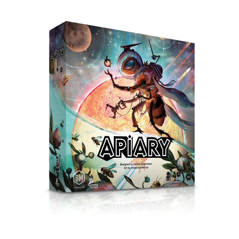 In Apiary, each player controls one of twenty unique factions. Your faction starts the game with a hive, a few resources, and worker bees. A worker-placement, hive-building challenge awaits you: explore planets, gather resources, develop technologies, and create carvings to demonstrate your faction's strengths (measured in victory points) over one year's Flow. However, the Dearth quickly approaches, and your workers can take only a few actions before they must hibernate! Can you thrive or merely survive?