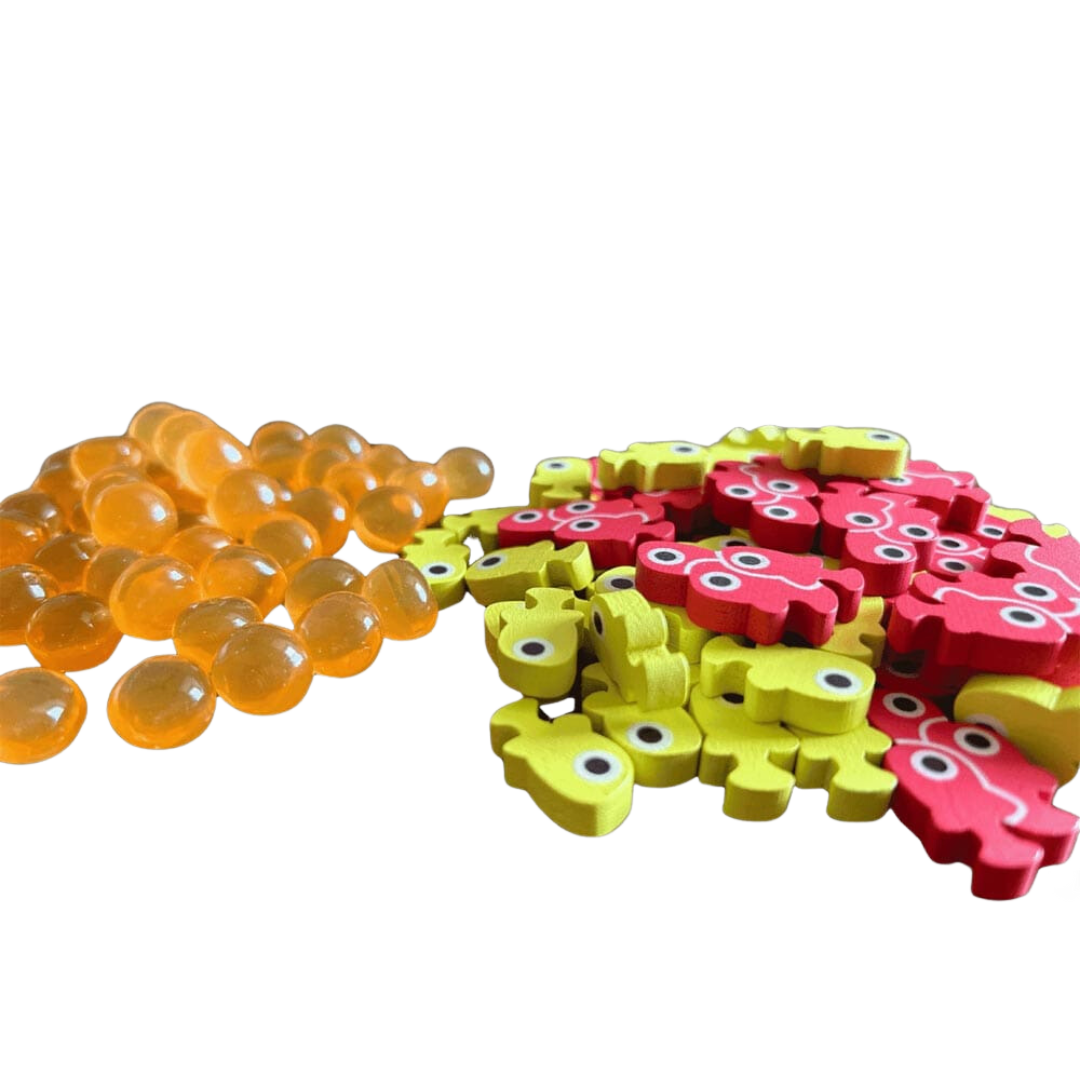 These 40 wooden young tokens, 20 wooden school tokens, and 50 squishy egg tokens (TPR plastic) were designed specifically for Finspan (the game includes cardboard tokens).