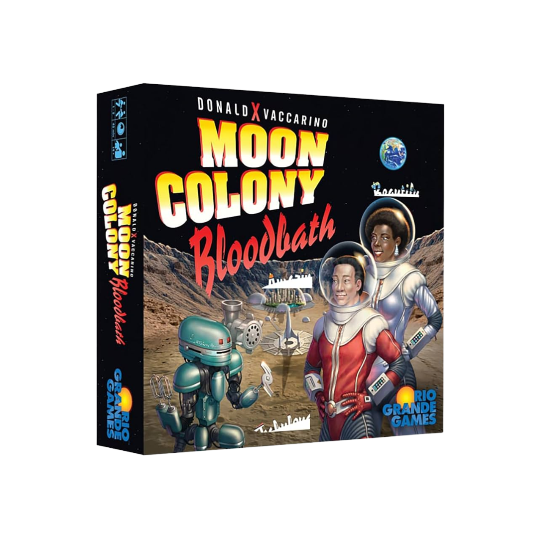 Moon Colony Bloodbath is an engine-building, engine-losing tableau game, with a shared deck the players build that makes things happen, many of them bad things that kill people in your moon colony, but some positive, and some that let you build up.