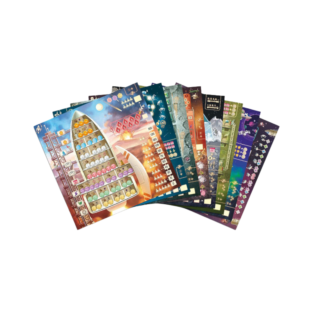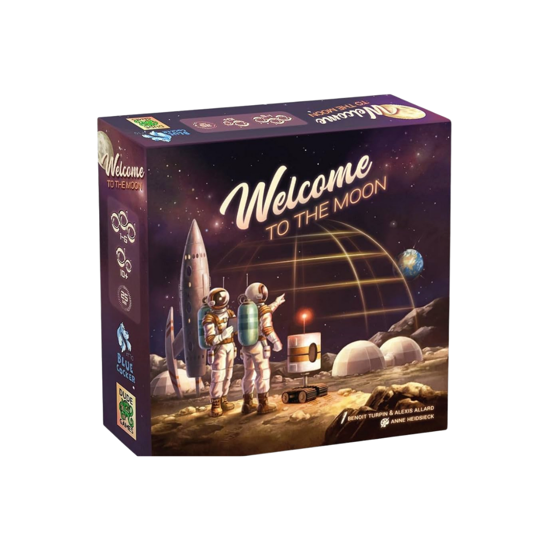 Welcome to the Moon uses the same flip-and-write game mechanisms as the earlier title Welcome To..., but now you can play in a campaign across eight adventure sheets. On a turn, you flip cards from three stacks to create three different combinations of a starship number and a corresponding action, then all players choose one of these three combinations. You use the number to fill a space in a zone on your adventure sheet in numerical order, and everyone is racing to be the first to complete common missions.